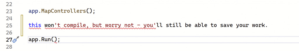 Another subtle way Visual Studio helps is one you probably never gave a second thought. No matter what state your working files are in, you'll never mess one up so badly that Visual Studio won't let you save your work: